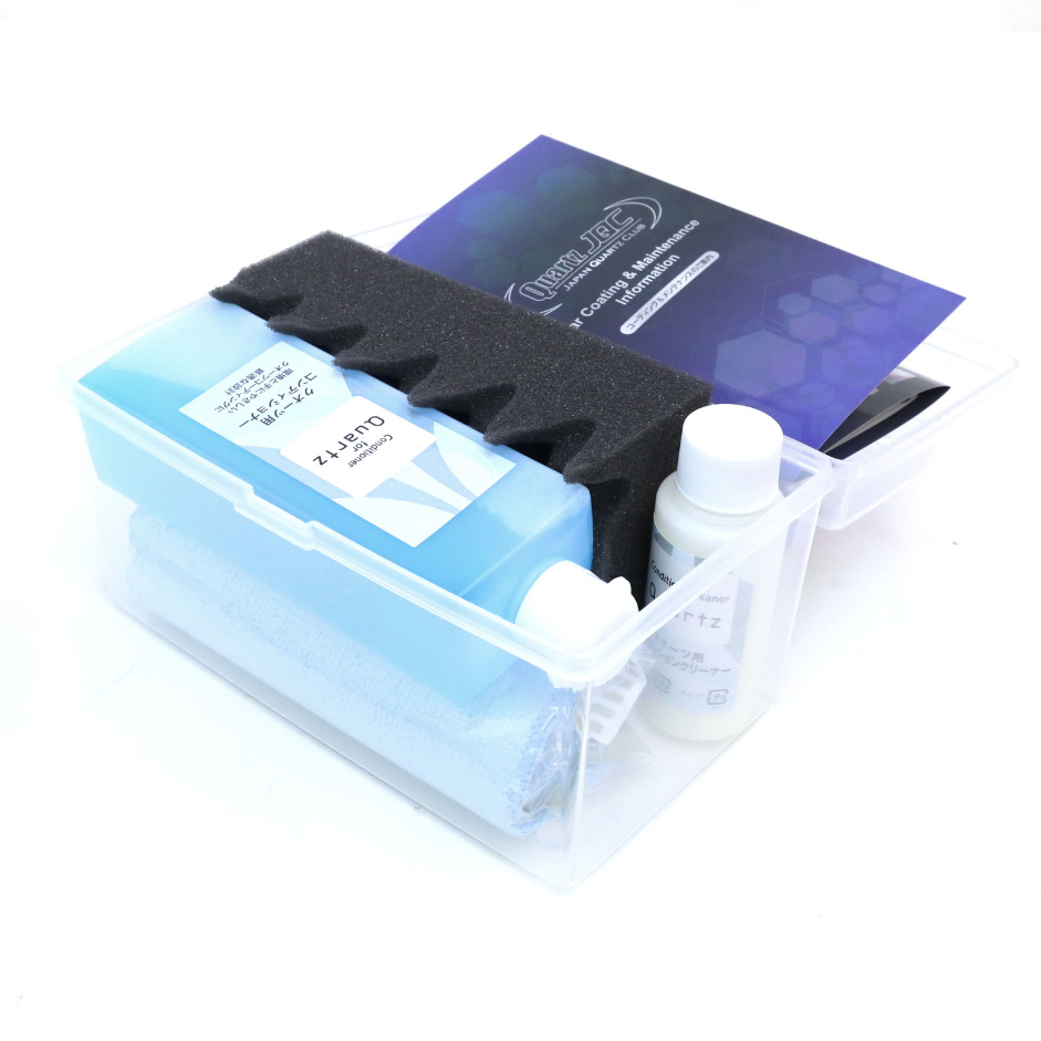 コンディショナーシャンプー・クリーナー・スポンジ・クロスがセットされた標準のクォーツ洗車セットです。虫跡や雨ジミなどシャンプーで落ちないダメージはクリーナーで軽く擦り、除去できているか確認しながらお試しください。